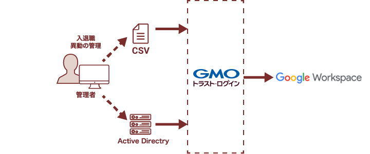 Google Workspace(G Suite)の運用に際して、「GMOトラスト・ログイン」に登録している従業員(ユーザー)情報を元に、 Google Workspace(G Suite)ユーザーの追加や削除、修正の同期が可能となります。 本来管理者が手動で行う生成・削除・修正といった手間を省くことができるので、 利便性が大きく向上します。
